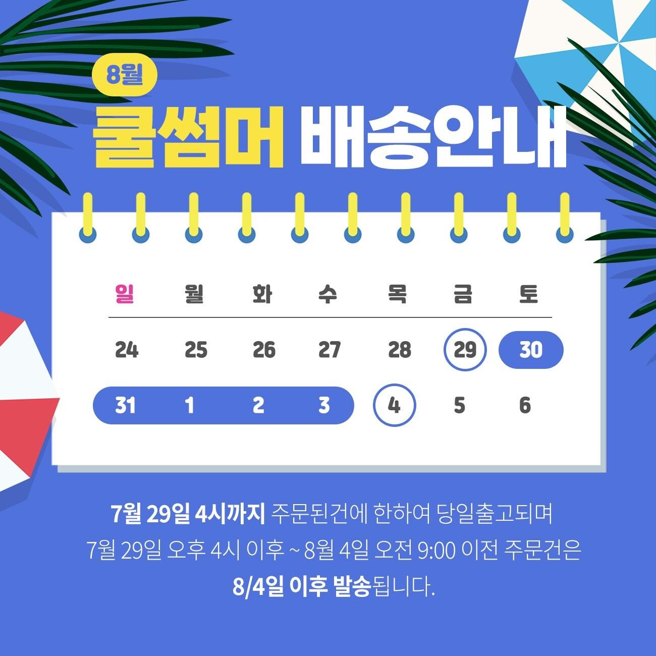 29일 오후 4시까지 주문건은 당일 배송되며 휴가기간 내 주문건은 8월4일 일괄 발송됨을 알려드려요. 무더운 날씨, 시원한 휴가 보내세요.